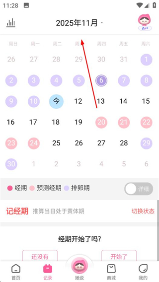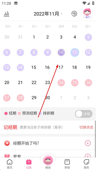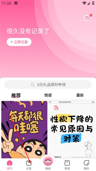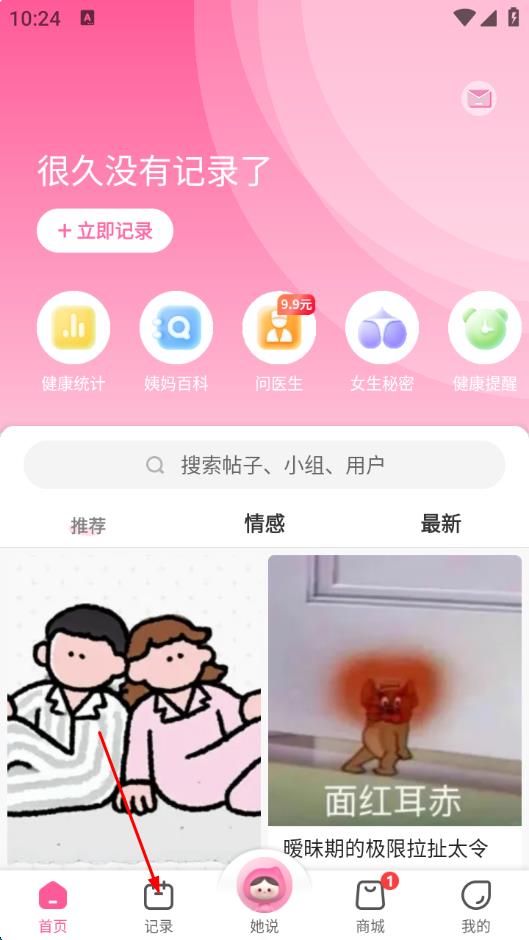 1、打开大姨妈APP,点击底部导航栏的记录。