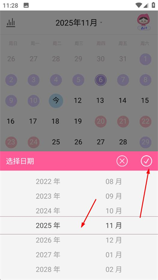 3、在弹出的选择日期界面中,选择要查看的年份和月份,点击右侧的对勾按钮。