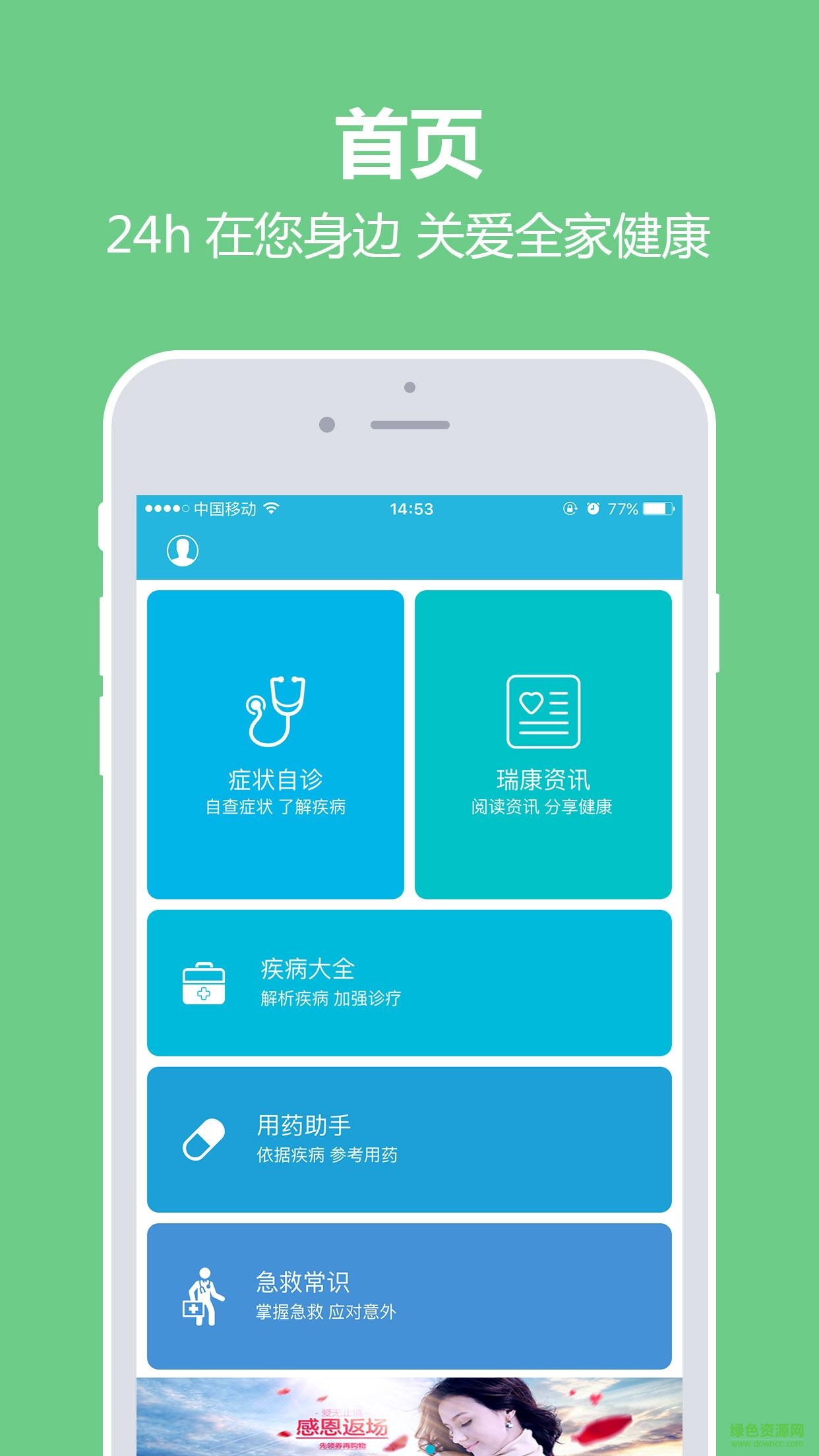 瑞康医生app是一款专为用户打造的自诊软件,通过手机端,用户可以随时自诊自查,俗话说的好,大病都是由小病引起的,瑞康医生就是帮你把小病扼杀在摇篮中,早日发现身体疾病,早日医治。欢迎来绿色资源网下载。