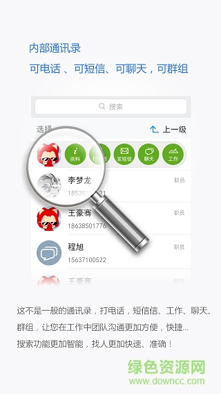 企业内部微信:基于企业内部通讯录,采用类微 信的方式,为每个企业提供内部即时通讯服务。公司员工之间可通过即时通信、短信和语音进行无缝沟通。下一步将支持基于手机的内 部语音会议;