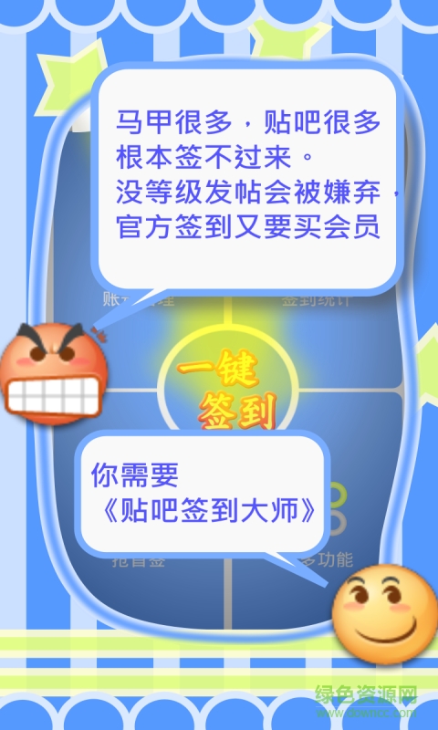 贴吧签到大师是一款专门为用户设计的贴吧等级签到助手工具,你不用在愁时刻签到几个自己关注的贴吧签到了,你还愁自己的贴吧等级低吗?那就赶紧下载此助手工具吧,方便快捷,欢迎来绿色资源网下载。