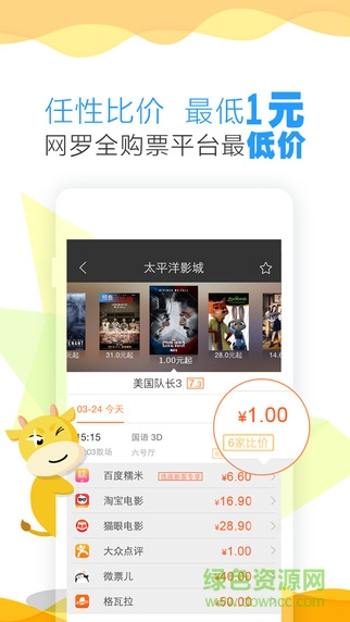 票贩儿比价是一款由北京易越信息技术有限公司专为喜欢看电影的朋友开发的比价应用,各大园购电影还觉得不划算嘛,那就让票贩帮你选择吧,看看谁家团购最便宜,我们就选那家,喜欢看电影的朋友赶紧来绿色资源网下载吧