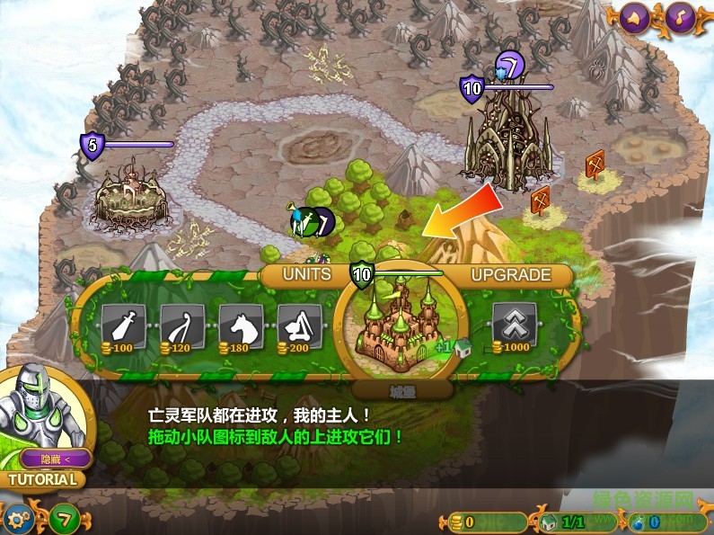 变态版提示:战斗开始后,玩家点击主基地,然后选择雇佣的兵种出兵,再点击兵种头顶上的图标,然后选择要进攻的目的地,这样就能成功发兵攻击;过关后能对各种兵种进行升级。点击基地或兵营,然后点击UPGRADE能进行升级。点击左下角的箭头能加速进行游戏。点击游戏最下面的各个图标能使用各种技能。