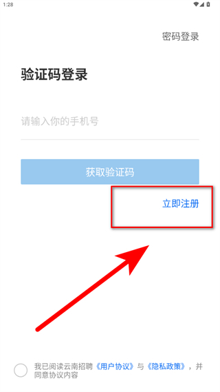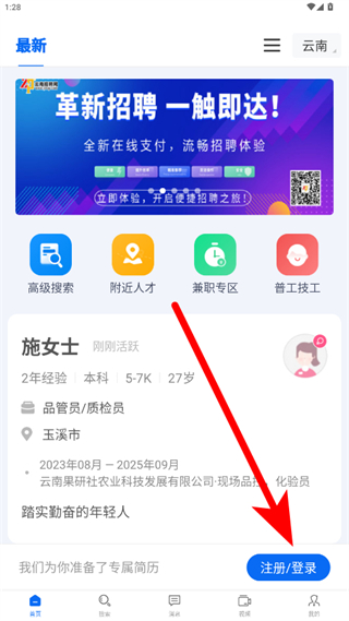 1、打开云南招聘网企业招聘版APP,点击右下角注册/登录,进入登录注册页面。