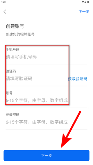 3、在创建账号界面,填写手机号码、验证码、账号、登录密码后,点击下一步。