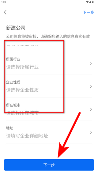 4、进入新建公司页面,填写公司名称、所属行业、企业性质、所在城市等信息,点击下一步,完成企业账号注册。
