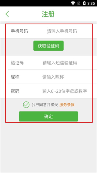 3、填写手机号码等信息,勾选同意服务条款,点击确定完成注册。