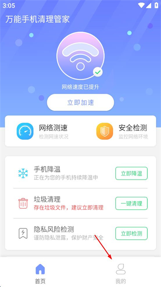 1、在万能手机清理管家首页点击右下角我的图标,进入我的界面。