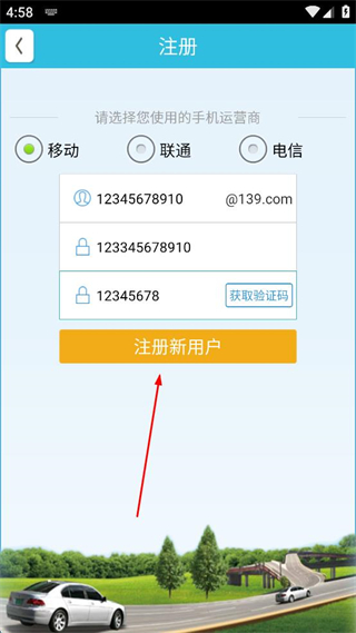 3、在注册页面选择手机运营商,填写手机邮箱、密码并获取验证码。