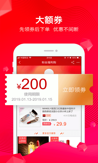 1、实惠:网罗各类优惠券、限时抢、聚划算等商家活动,让用户省钱
