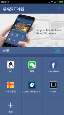 喵喵双开神器是一款可以帮助用户实现账号双开的手机工具,用户使用此软件后,便可以在诸如:qq,微信,facebook,uber等多款软件上进行双开,从而可以帮助用户解决不少麻烦,有需要的朋友们千万不要错过哦!快来绿色资源网下载体验吧!