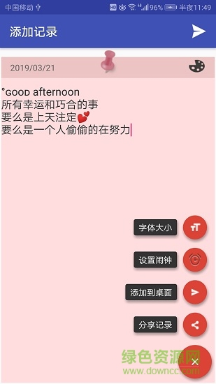 这是一款简洁易用的时时便签小工具,您可以根据自己喜欢的彩色或者心情设置便签的背景颜色,您可以根据便签内容设置闹钟提醒功能,您可以根据自己的喜好设置字体大小,您可以把便签添加到桌面或者分享给他人,您也可以更换自己喜欢的皮肤,总之,您可以随心设置自己的喜好,让您用起来更加的得心应手的体验!