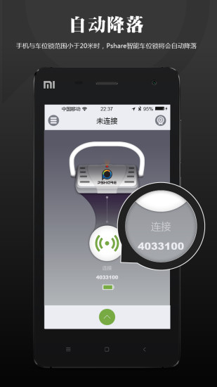 Pshare智能车位锁属智能化停车专用产品,可有效防止私人专用车位被其它车辆占用,真正享有私车停放的便利空间;抛弃手动车位锁与遥控车位锁使用带来的烦恼,人不离车,轻松掌握科技带来的高品质生活。泊享是一款用于智能车位锁的升起或降落的手机智能遥控软件。泊享可以帮助车主轻松地使用智能车位锁,不用手动,只要按下手机按钮,车位锁自动升起降落,轻松搞定锁车。