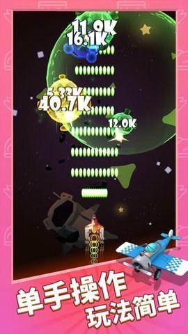 1、玩家在太空中通过滑动屏幕控制飞机,要小心躲避敌人进攻的同时将其击毙;