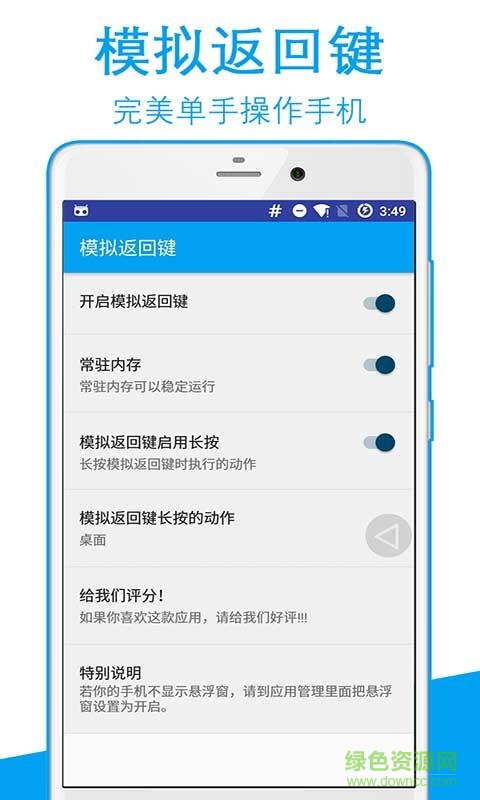 模拟返回键是一款针对安卓手机的虚拟返回键,如果你的物理键已坏或者不忍心折磨它,就来使用模拟返回键吧,帮你减少对物理键的磨损和消耗,更好的帮助用户使用手机,且对于大屏手机,好处更加不可言喻。欢迎来绿色资源网下载。