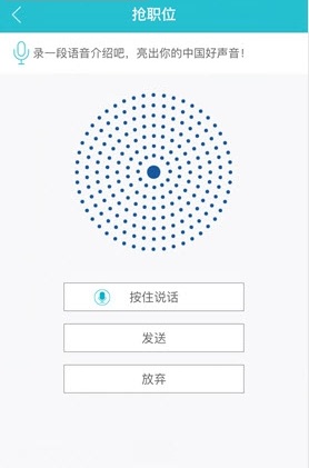 语音抢职位,亮出你的中国好声音,让企业对你印象更加深刻,一个区佧号便可代替万张简历,你可去掉麻烦的纸质简历,带上你的区佧号即可