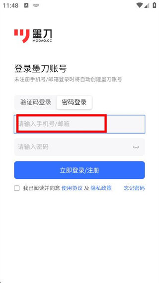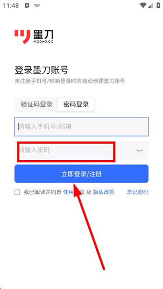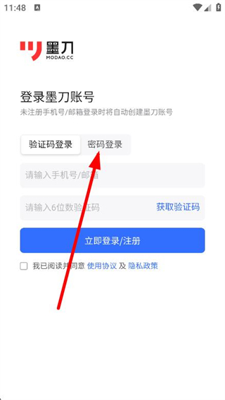 1、打开墨刀app,在登录页面点击上方的密码登录。