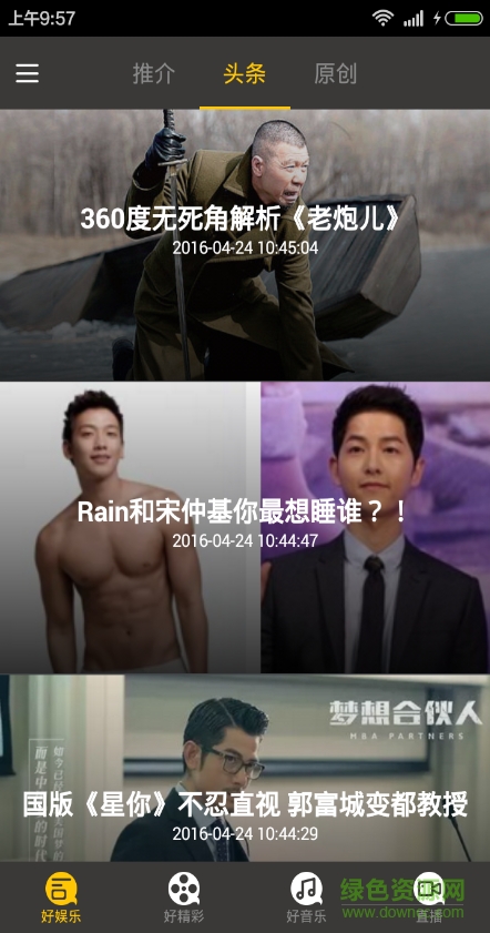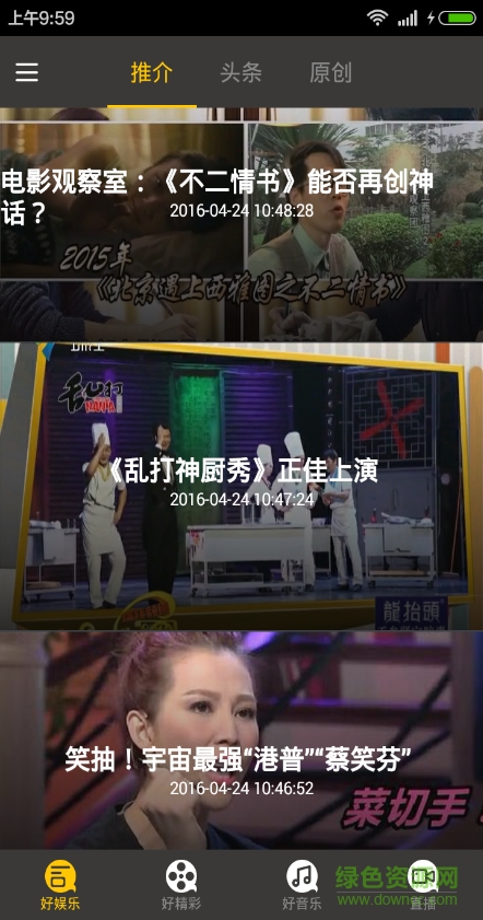 好娱乐app是一款娱乐资讯阅读类手机软件,这里含有最新最热的娱乐资讯,有最新的音乐榜单和mv展示,还有热门话题等你来参与,同时还可以看精彩的直播哦,喜爱的朋友赶快到绿色资源网下载体验吧!