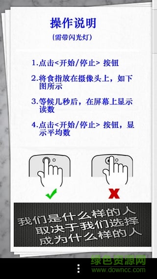 本应用可以很简单地测量出你的心率,只要轻轻的把食指放在摄像头上10秒,心率就能测出来了。