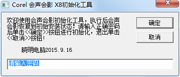 会声会影X8初始化工具是一款Corel VideoStudio Pro X8初始化应用程序工具,执行后可以恢复到初始安装状态,输入密码后点确定按钮就搞定了,使用密码:xiaomingdiannao,赶紧下载吧