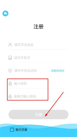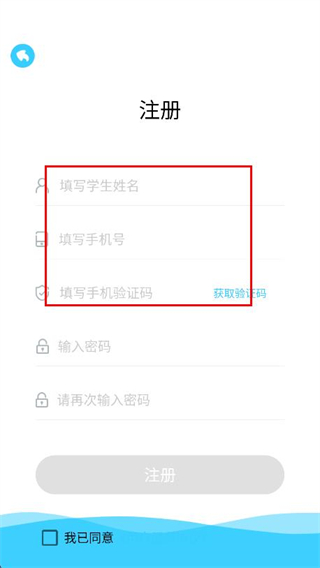2、在注册页面依次填写学生姓名、手机号和验证码。