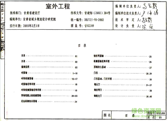 甘02j09图集主要适用于甘肃地区的民用建筑图集,本图集是有关室外工程设计的,方便工程人员学习和参考。有需要的朋友,快来绿色资源网下载吧!