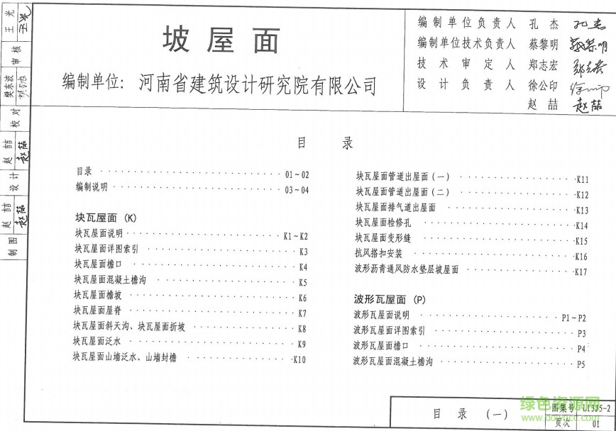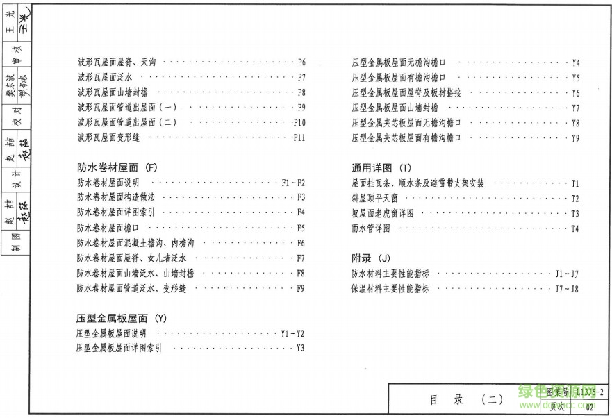 L13J5-2坡面屋图集编入的坡屋面内容有块瓦屋面、波形瓦屋面、压型金属板屋面和防水卷材坡屋面及其节点构造做法等。