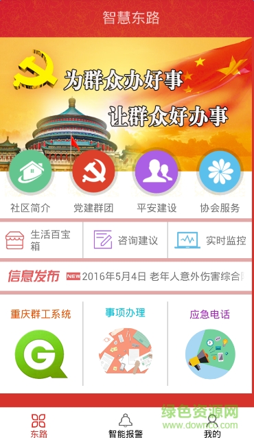 智慧东路app,为宝圣东路社区推出的一款社区综合服务平台。用户可以随时使用本平台呼叫生活服务,更有社区最新消息随时查看,不多过任何通知。智能报警让你生活更加安全,需要的用户就快来绿色资源网下载吧!