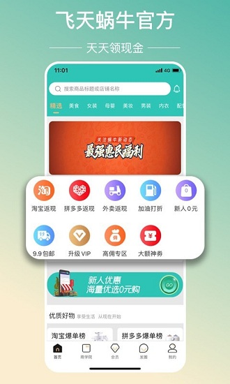 飞天蜗牛app不但可免费领取各大平台隐藏的大额优惠券,还能为买家提供高佣返利,飞天蜗牛app同时所有享益粉丝还可享受手机话费、音乐/视频会员充值等超100项优惠特权,覆盖你吃喝玩乐所有的线下生活场景,让你消费就省钱,分享就赚钱.......