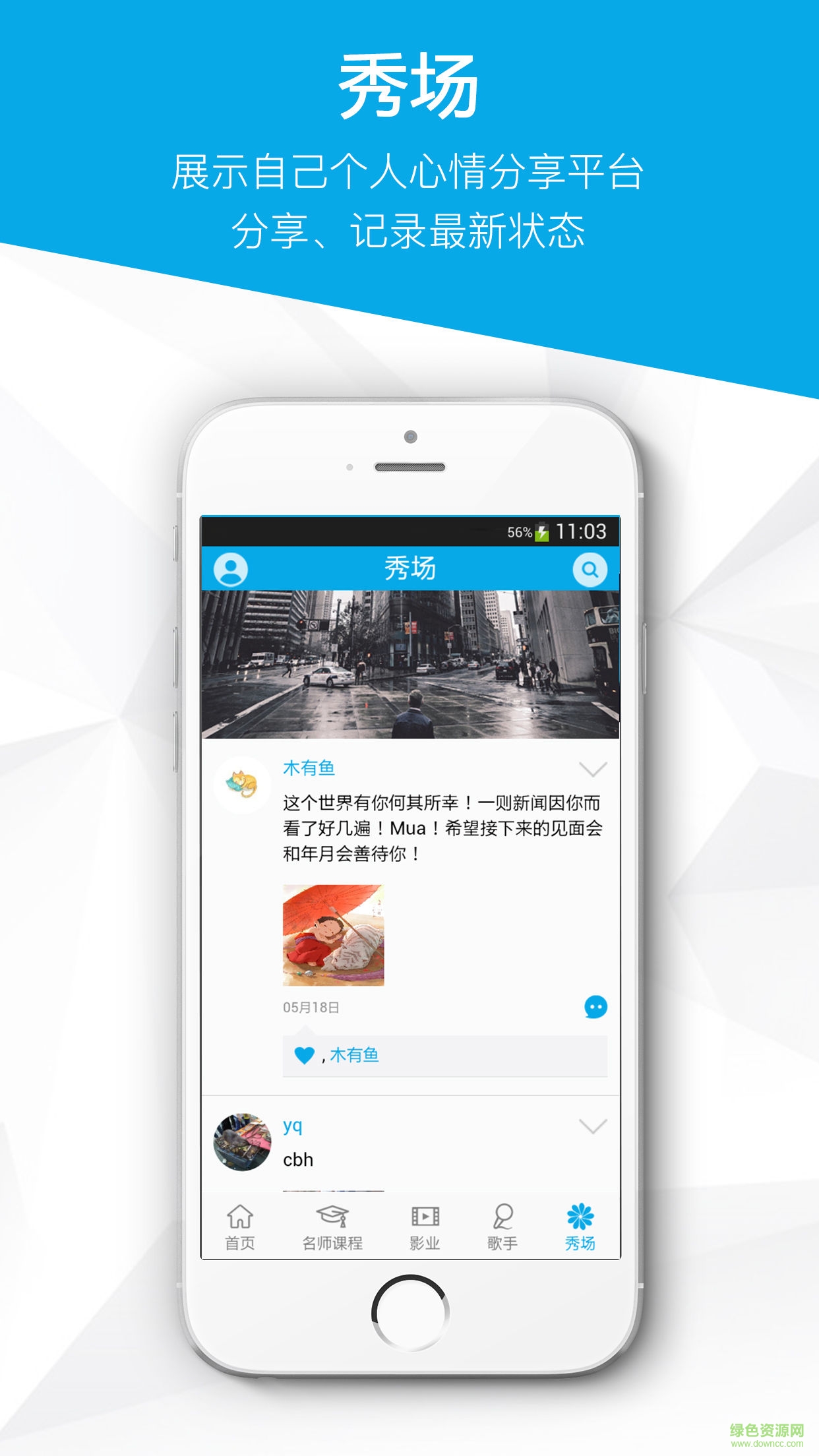 3.秀场,展示自己个人心情分享平台,分享、记录最新状态。