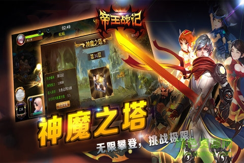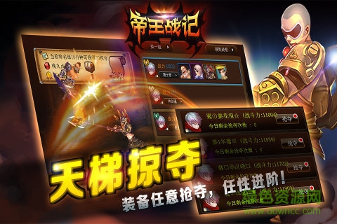 《帝王战记》:故事背景采用倒叙的手法,让玩家在历史的长河中游历,不单单可以进行激烈的游戏,更能再次经历历史上的经典时刻,和古代帝王一起开疆拓土,建功立业。游戏传统系统包括了:帝王召唤、装备抽取及铸造、丰富的任务系统、PVP和PVE战斗系统、经典的离线系统。