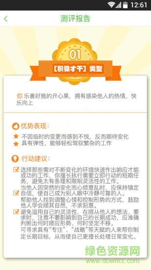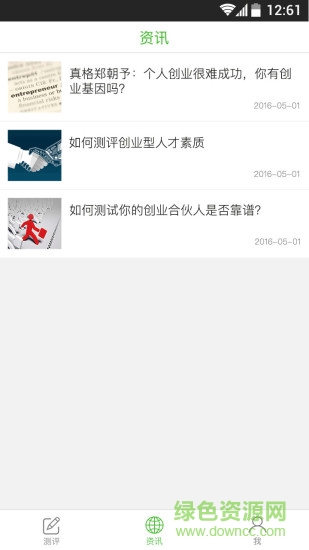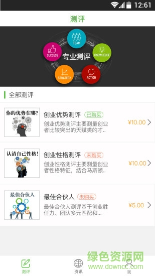 创业云测手机版,是一款专为创业人员推出的创业资讯以及自我认知平台。你在这里可以随时测试自己的天赋和性格,让创业方向更加明确。更有超多创业资讯随时浏览,促进创业进度,感兴趣的用户就快来绿色资源网下载吧!