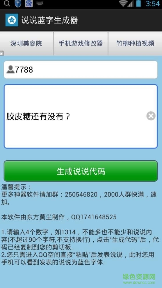 2、只需将填写您的QQ号码(或者其它QQ号)、说说或者评论内容,将生成代码复制到手机qq空间;
