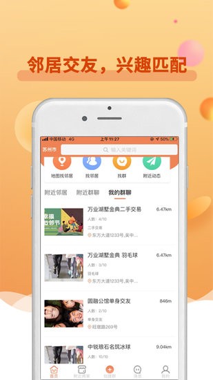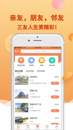 邻友友手机版让用户可以认识更多的邻居朋友的邻里交友软件,为用户搜寻周边社区的用户进行匹配,让用户随时可以和邻居一起相约出去玩,还有更多的邻里服务可以体验。