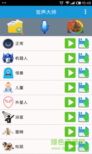 3、几十种预置好的声音效果可供选择:机器人、怪兽、蓝精灵、合唱、潜水、儿童、外星人、浴室、蜜蜂、松鼠、死神、山洞、快速、氦、氟化物、电话、醉酒、风扇、旧收音机、宇航员。