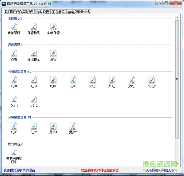 网吧语音播报工具是专门为网吧打造的一款网吧语音播报软件,相信去网吧玩过的小伙伴们都知道,网吧会有这种语音播报服务,如点外卖、通宵包夜时间、物品保管、禁止吸烟等,有需要的快来绿色资源网下载使用吧。