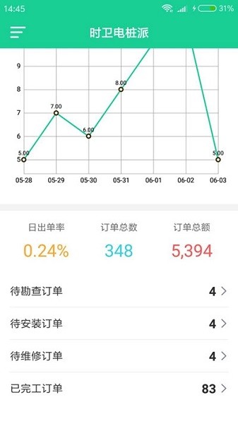 时卫电桩派软件是提供电桩充电管理服务的应用软件,界面干净简单,功能丰富实用,可以随时查看订单,订单状态信息一手掌握,总派单数、在线电工等轻松处理,带来更加高效的管理操作,帮助大家快速给车辆充上电。操作简单又快捷,十分方便!