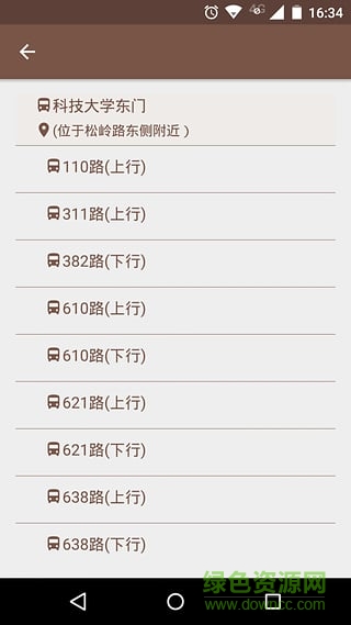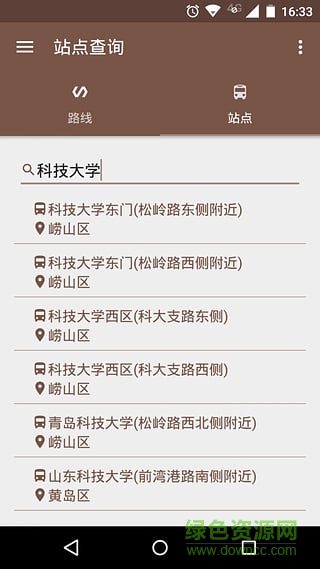 2.站点名称查询,比如青岛科技大学站,我们可以搜索科技大学,选择科技大学西区,系统将自动罗列科技大学附近的公交车供我们选择!