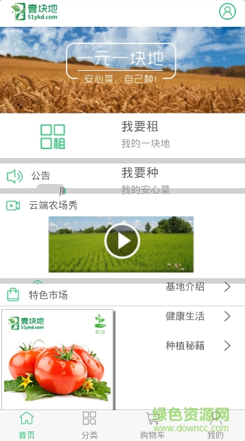 51YKD app,专为想要体验农庄生活而没有时间的城市工作用户所推出的租地种菜平台。只要下载安装本平台,便可以随时在手机上管理你的私人菜地,随时查看菜地的实际情况,更可以随时收割成熟菜品为你送货到家,体验收获的乐趣,感兴趣的用户就快来绿色资源网下载吧!