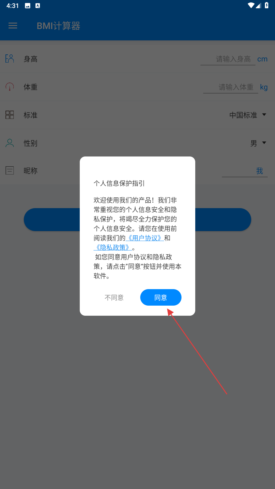 1、打开bmi计算器,进入时会弹出个人信息保护指引,点击同意的按钮。