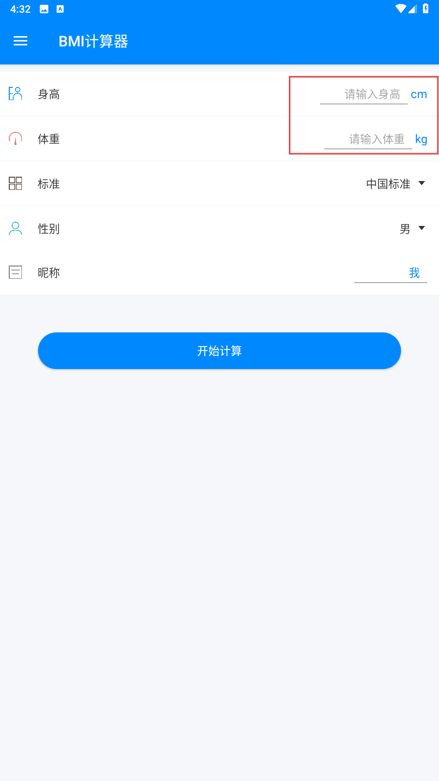 2、在bmi计算器的页面内,在身高、体重的输入框内输入相关信息。