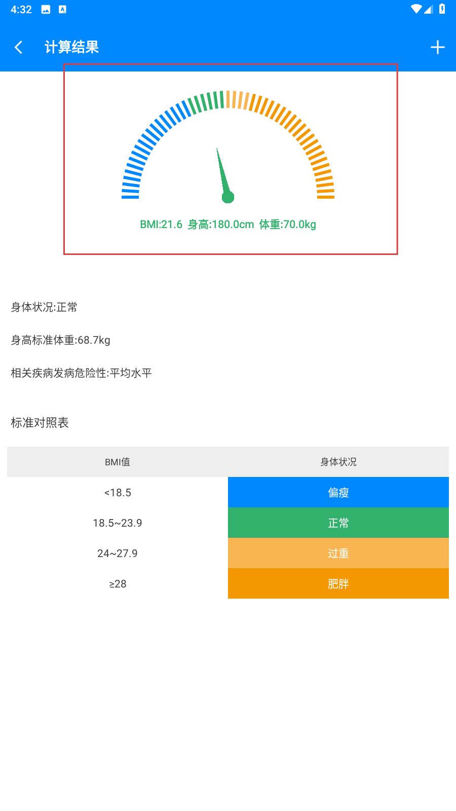 3标准体重计算,根据身高体重,自动计算标准的体重参考值,方便决策减肥还是增重