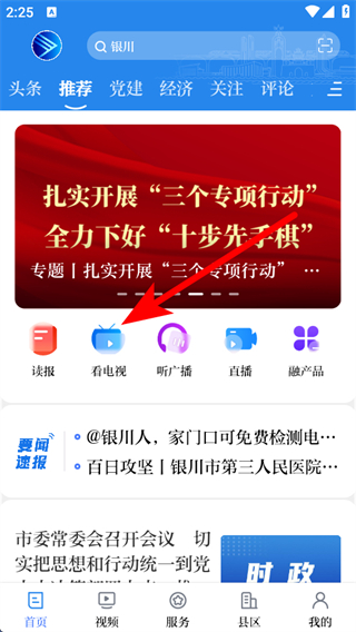 1、打开银川发布APP首页,点击看电视功能入口,进入电视频道选择页面。