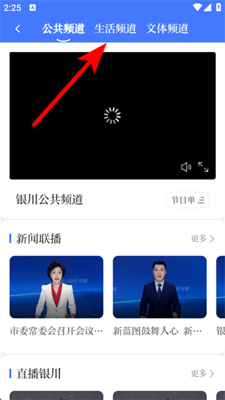 2、在电视频道页面中,点击生活频道标签,切换到银川生活频道界面。