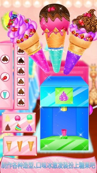 第二个阶段,你可以帮公主制作冰淇淋了,选择一个冰淇淋蛋筒和冰淇淋头,点击冰淇淋机器的按钮,然后完成冰淇淋的制作。接下来,你可以用新鲜的水果和巧克力来装饰冰淇淋,也可以给冰淇淋浇灌可口的奶酪让冰淇淋更加美味。