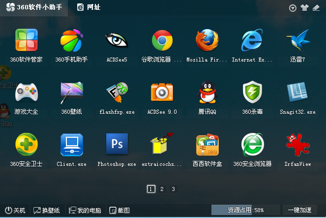 360软件小助手除了可以快速开启电脑上的软件外,还有“一键关机“、”桌面截图”、“一键加速“、“换壁纸”、网址导航等功能。