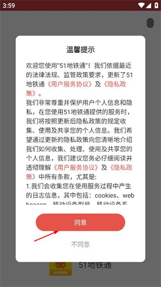 1、打开51地铁通,查看弹出的温馨提示内容,点击界面中的同意按钮以继续使用。