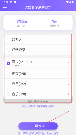 4、在选择要发送的资料页面,勾选需要发送的文件类型,然后点击一键发送按钮,即可开始传输文件。