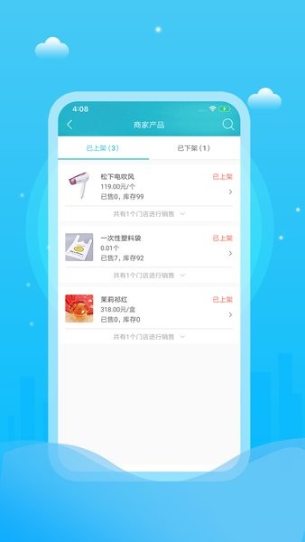 1、商家产品,用户在应用中就能对商品实现上下架操作,简单方便;