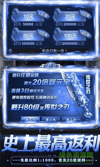 首冲赠送顶级专属武器,装备宝箱,贵族特权卡,限量版称号,直升丹等,装备无忧,绝对超值